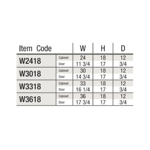 Cabinet Dimensions: 24W x 18″H x 12″D, 30″W x 18″H x 12″D, 33″W x 18″H x 12″D, 36″W x 18″H x 12″D
