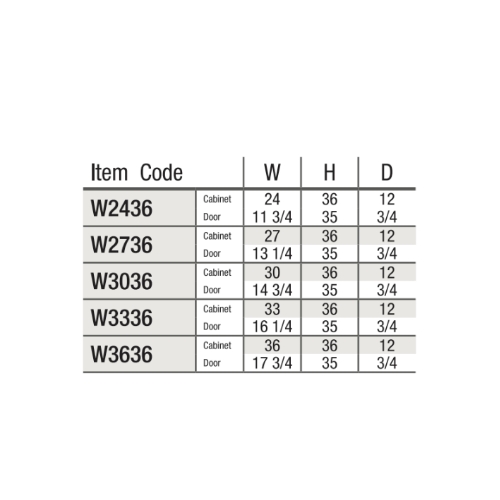 Cabinet Dimensions: 24″W x 36″H x 12″D, 27″W x 36″H x 12″D, 30″W x 36″H x 12″D, 33″W x 36″H x 12″D, 36″W x 36″H x 12″D