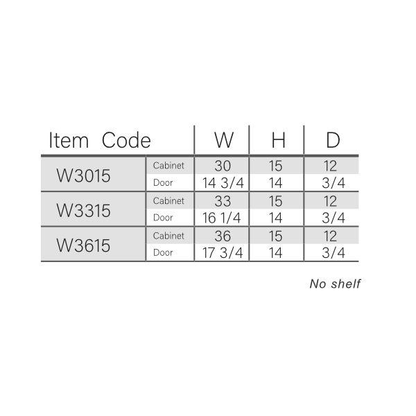 Cabinet Dimensions: 30″W x 15″H x 12″D, 33″W x 15″H x 12″D, 36″W x 15″H x 12″D
