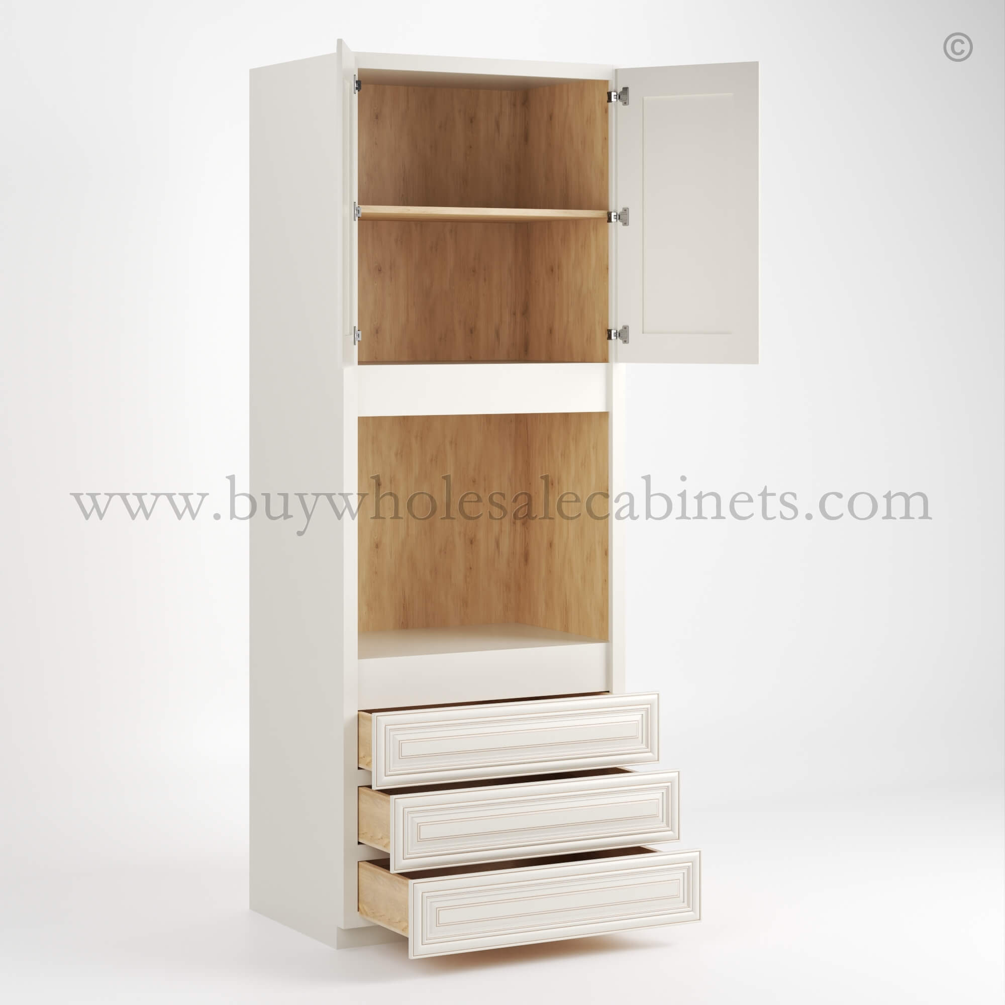 Charleston White Raised Panel 30″ W Double Door Oven Pantry Cabinet with Three Drawers