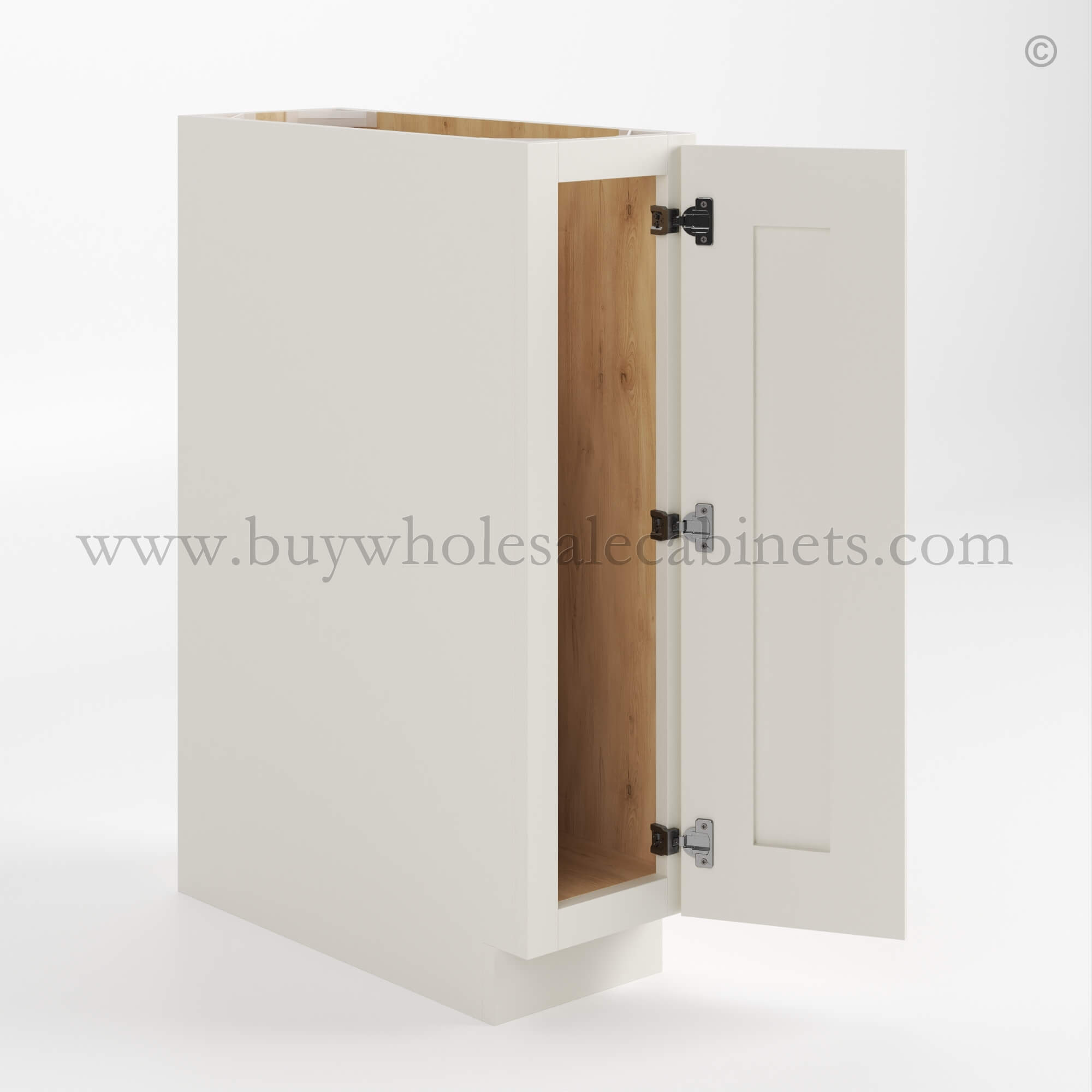 Our Charleston White Raised Panel Base Tray Cabinet is 9″ wide, 34.5″ tall, and 24 ″ deep.