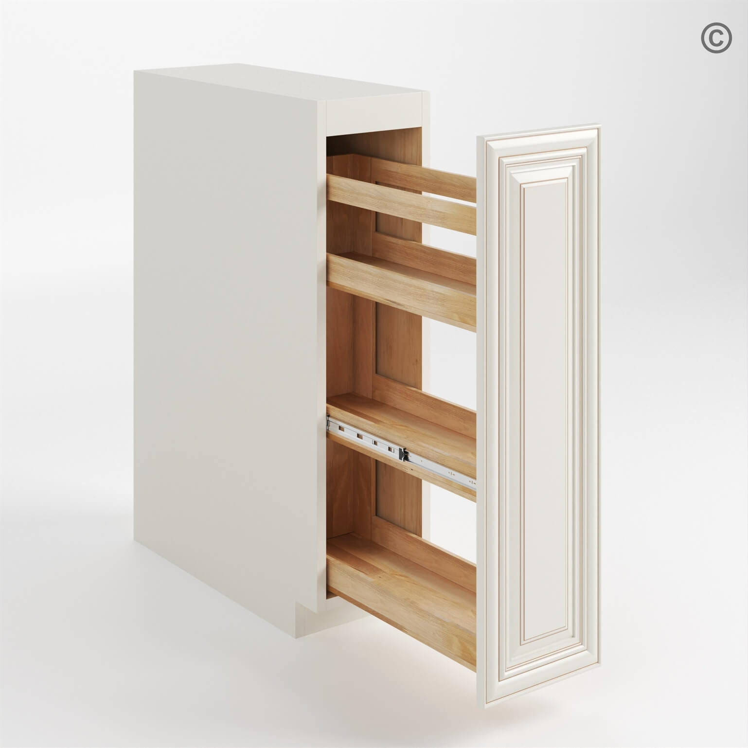 Designed for your convenience, this Raised Panel Charleston White spice pull base cabinet features soft-close, side mount full extension glides, ensuring smooth and quiet operation every time.