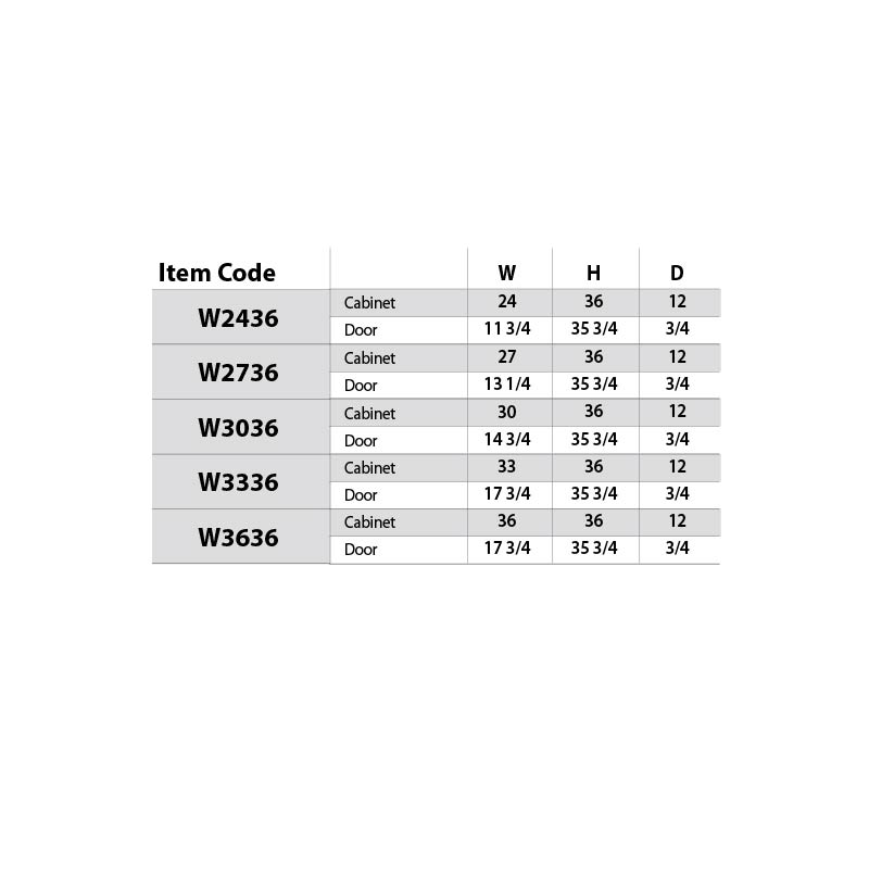 24"W x 36"H x 12"D ,27"W x 36"H x 12"D ,30"W x 36"H x 12"D ,33"W x 36"H x 12"D ,36"W x 36"H x 12"D |