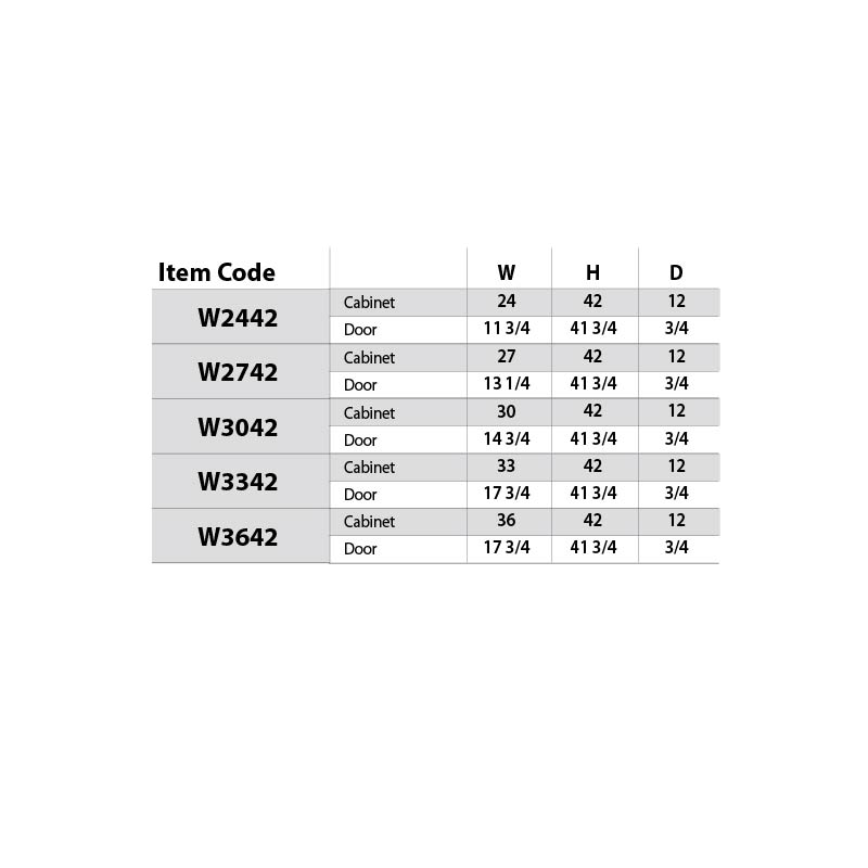 24"W x 42"H x 12"D ,27"W x 42"H x 12"D ,30"W x 42"H x 12"D ,33"W x 42"H x 12"D ,36"W x 42"H x 12"D |