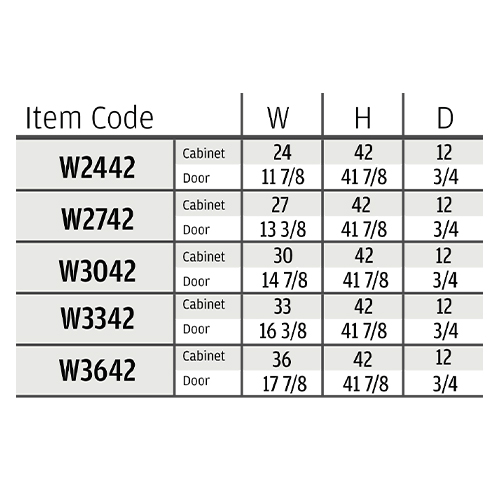 24"W x 42"H x 12"D ,27"W x 42"H x 12"D ,30"W x 42"H x 12"D ,33"W x 42"H x 12"D ,36"W x 42"H x 12"D |