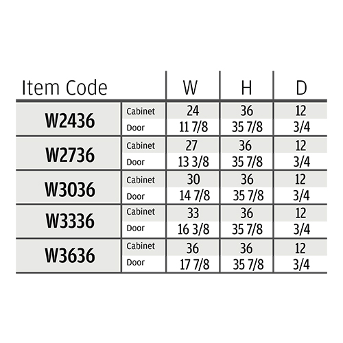 24"W x 36"H x 12"D ,27"W x 36"H x 12"D ,30"W x 36"H x 12"D ,33"W x 36"H x 12"D ,36"W x 36"H x 12"D |