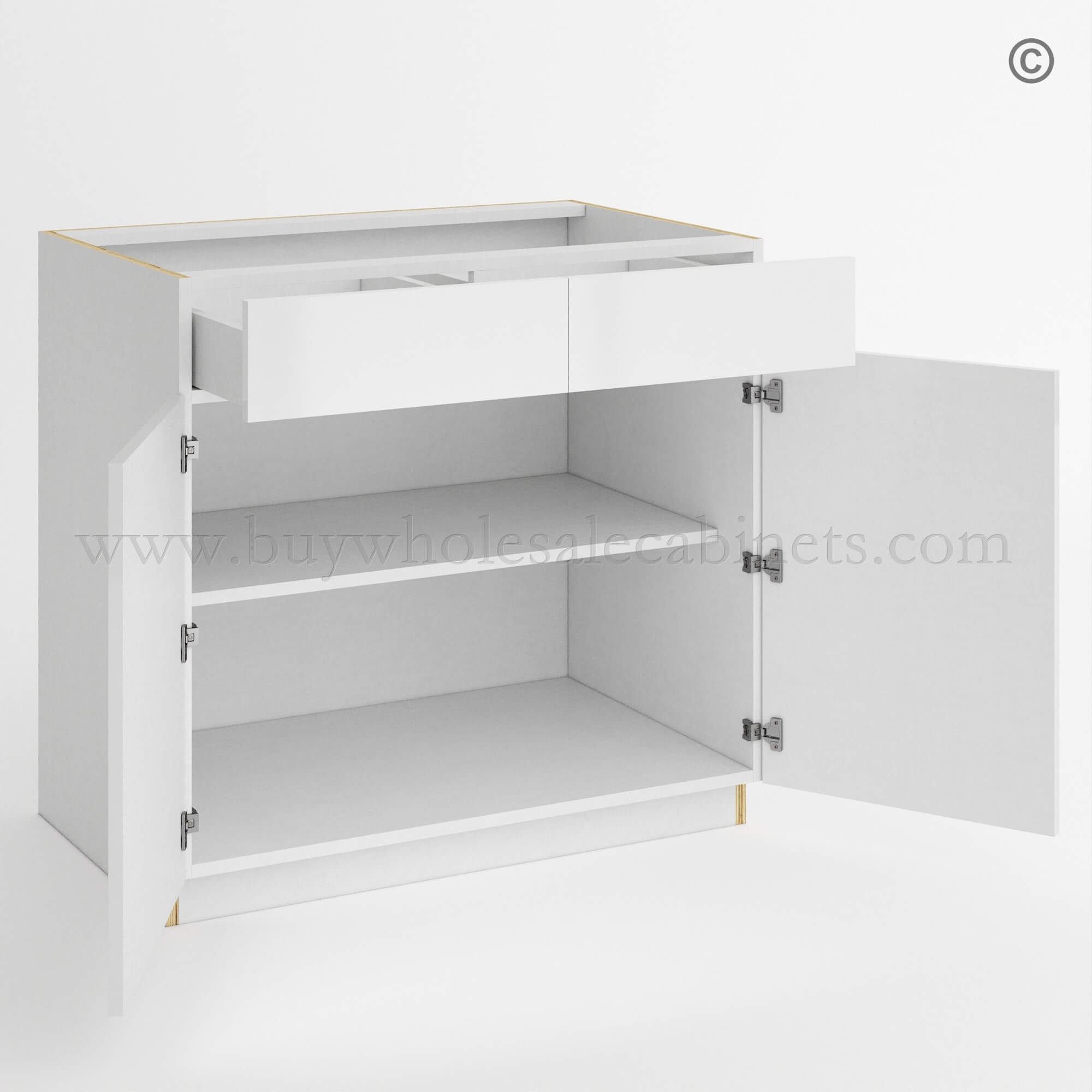 This RTA cabinet frameless white base double door and drawer will complete your kitchen! Design your perfect kitchen and check out our selection of Frameless Gloss White Cabinets.