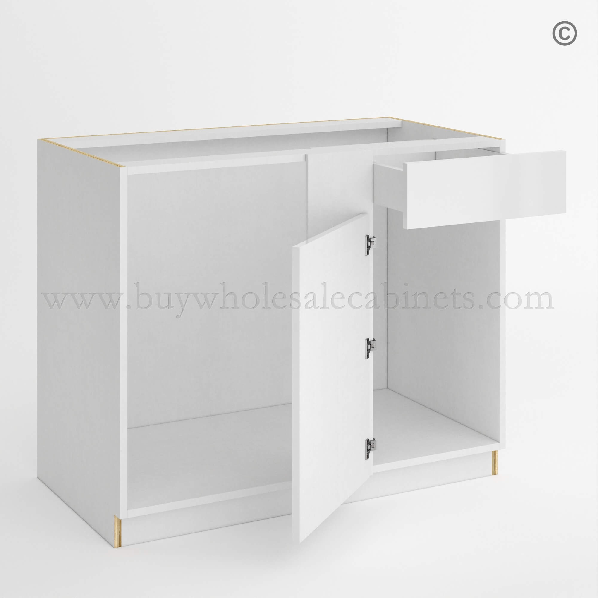 This RTA cabinet frameless white blind corner base will complete your kitchen! Design your perfect kitchen and check out our selection of Frameless Gloss White Cabinets.
