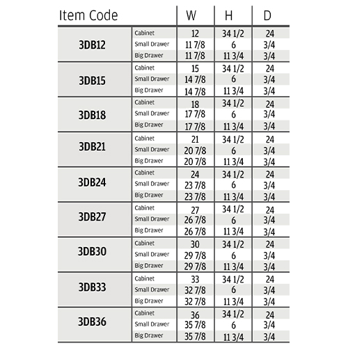 12"W x 34-1/2"H x 24"D ,15"W x 34-1/2"H x 24"D ,18"W x 34-1/2"H x 24"D ,21"W x 34-1/2"H x 24"D ,24"W x 34-1/2"H x 24"D ,27"W x 34-1/2"H x 24"D ,30"W x 34-1/2"H x 24"D ,33"W x 34-1/2"H x 24"D ,36"W x 34-1/2"H x 24"D |