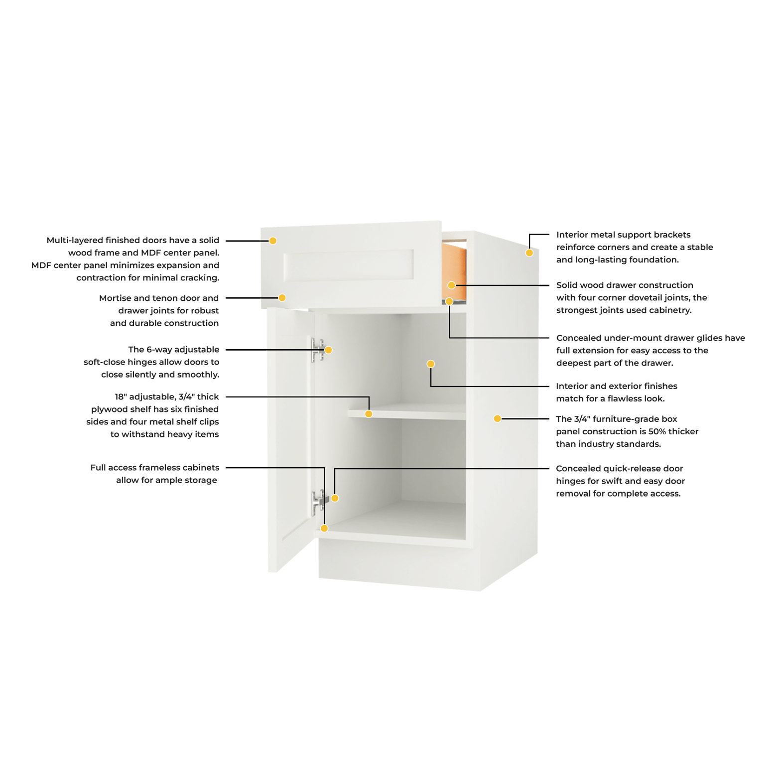 | Drawers | 5/8″ dovetail solid wood, soft-close, under-mount slides, full extension, 6-way adjustable |