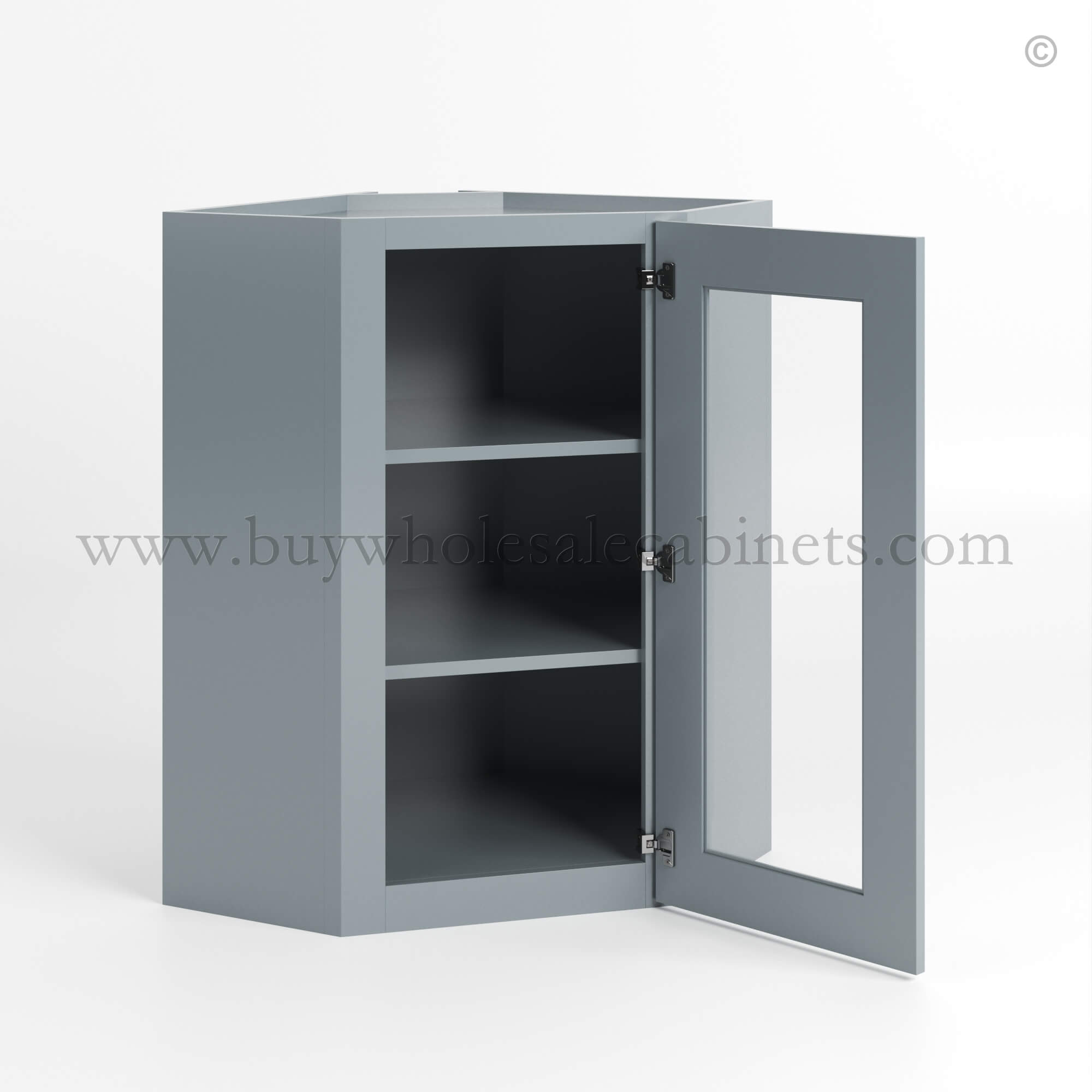 Our Gray Shaker 24 Diagonal Corner Wall Cabinet with Glass Door is 24″ wide, 12″ deep, and available in 3 heights (30″, 36″, and 42″).