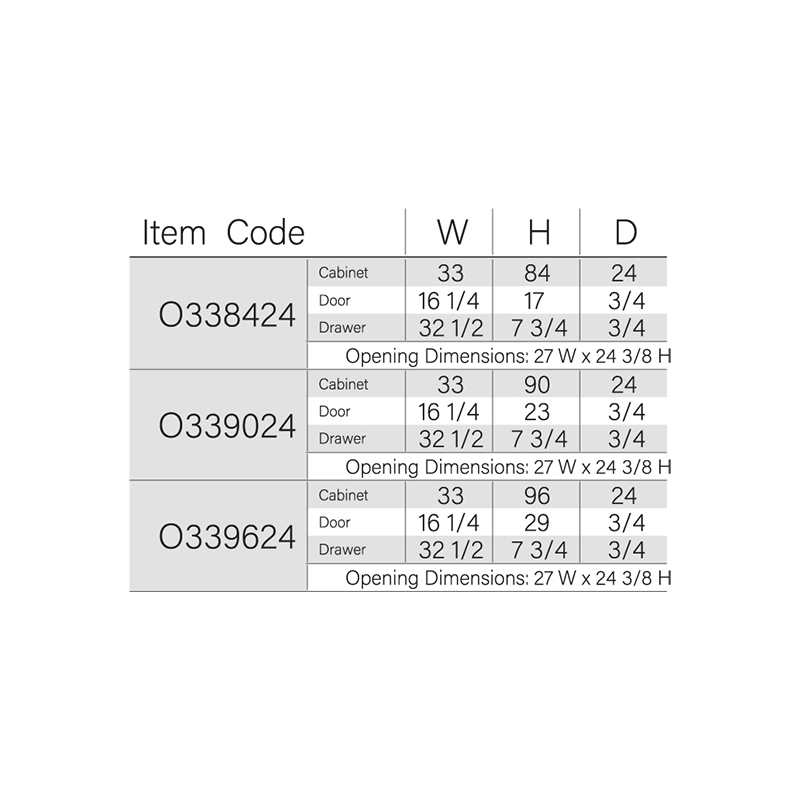 Cabinet Dimensions: 33″W x 84″H X 24″D, 33″W x 90″H X 24″D, 33″W x 96″H X 24″D