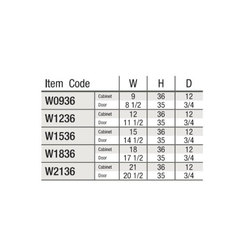 Our Gray Shaker 36 H Single Door Wall Cabinet is 36″ tall, 12″ deep, and available in 5 widths (09″, 12″, 15″, 18″, 21″).