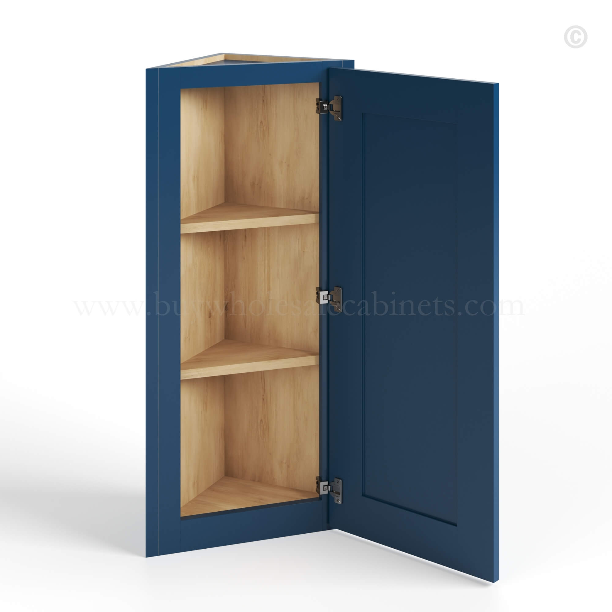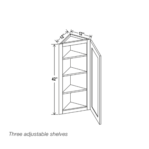 Our Navy Blue Shaker 12 W Angle Wall Cabinet is 12″ wide 12″ deep, and available in 3 different heights. (30″, 36″, 42″).