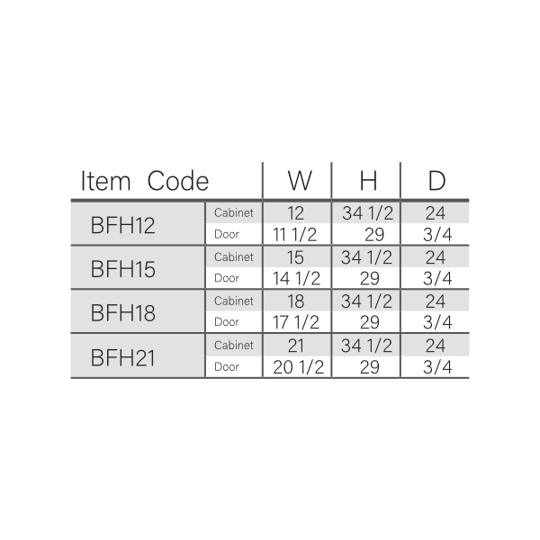 Cabinet Dimensions: 12″W x 34-1/2″H x 24″D, 15″W x 34-1/2″H x 24″D, 18″W x 34-1/2″H x 24″D, 21″W x 34-1/2″H x 24″D