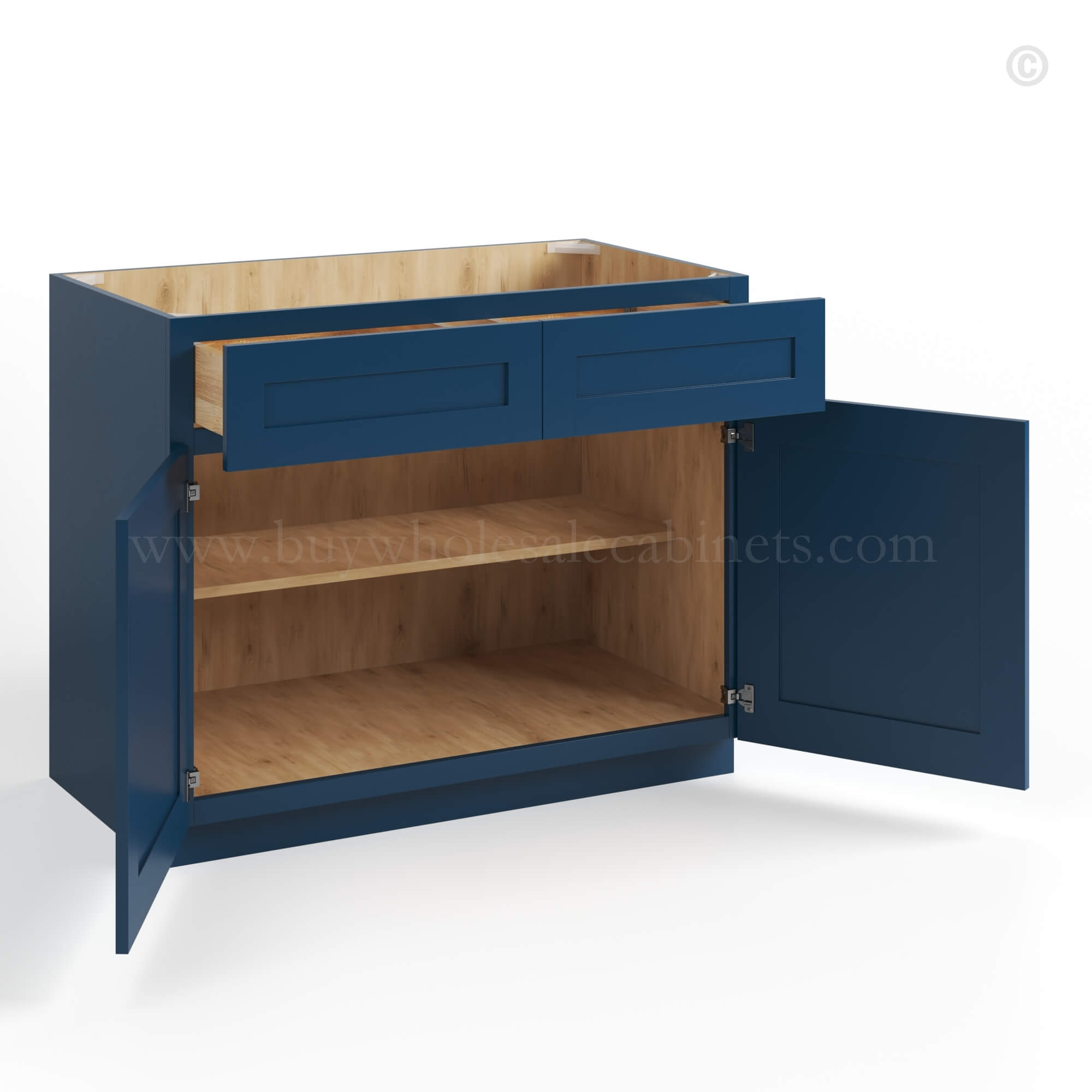Our Navy Blue Shaker Base Cabinet with Double Doors and Drawers is available in 4 sizes.