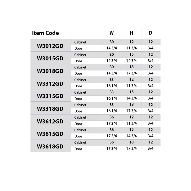 30"W x 12"H x 12"D ,30"W x 15"H x 12"D ,30"W x 18"H x 12"D ,33"W x 12"H x 12"D ,33"W x 15"H x 12"D ,33"W x 18"H x 12"D ,36"W x 12"H x 12"D ,36"W x 15"H x 12"D ,36"W x 18"H x 12"D |
