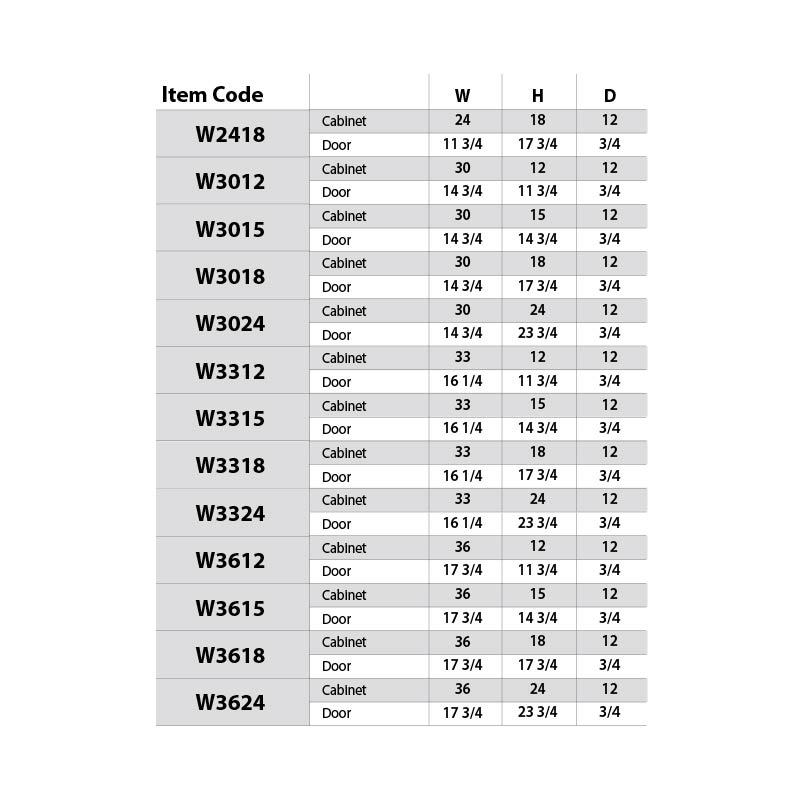 24"W x 18"H x 12 "D ,30"W x 12"H x 12"D ,30"W x 15"H x 12"D ,30"W x 18"H x 12"D ,30"W x 24"H x 12"D ,33"W x 12"H x 12"D ,33"W x 15"H x 12"D ,33"W x 18"H x 12"D ,33"W x 24"H x 12"D ,36"W x 12"H x 12"D ,36"W x 15"H x 12"D ,36"W x 18"H x 12"D ,36"W x 24"H x 12"D |