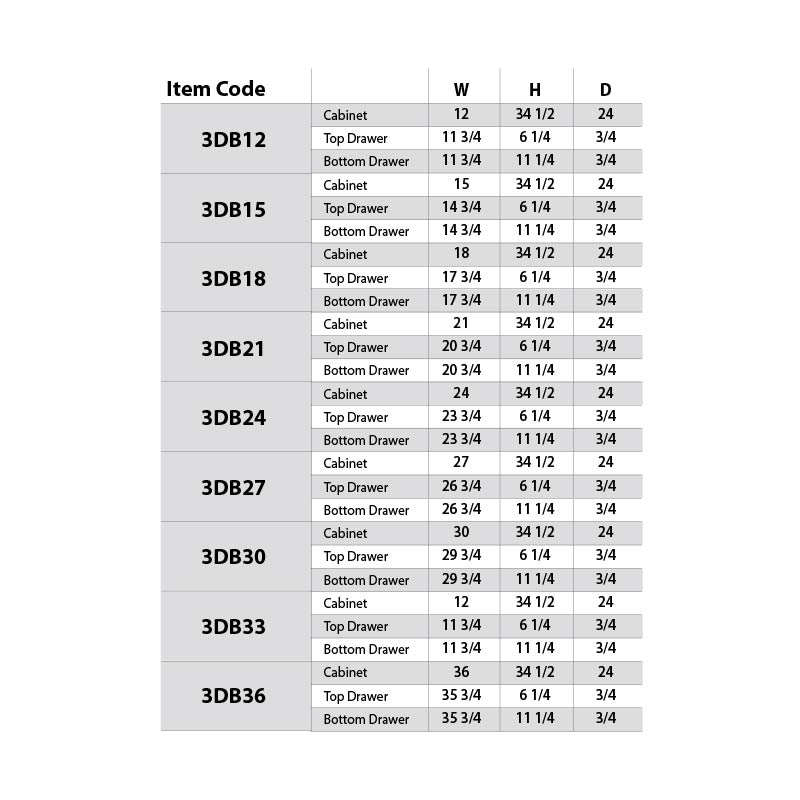 12"W x 34-1/2"H x 24"D ,15"W x 34-1/2"H x 24"D ,18"W x 34-1/2"H x 24"D ,21"W x 34-1/2"H x 24"D ,24"W x 34-1/2"H x 24"D ,27"W x 34-1/2"H x 24"D ,30"W x 34-1/2"H x 24"D ,33"W x 34-1/2"H x 24"D ,36"W x 34-1/2"H x 24"D |