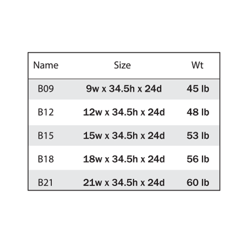 12"W x 24"D x 34 1/2"H ,15"W x 24"D x 34 1/2"H ,18"W x 24"D x 34 1/2"H ,21"W x 24"D x 34 1/2"H ,9"W x 24"D x 34 1/2"H |