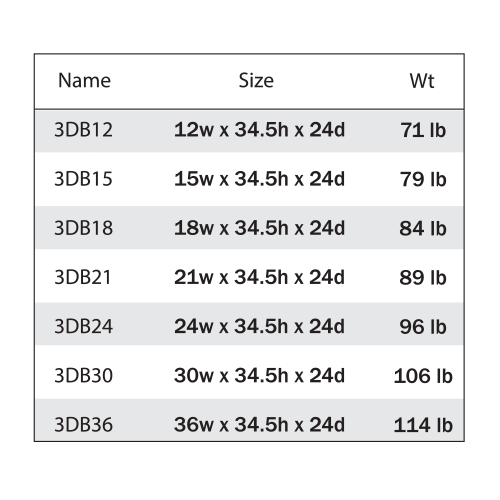 12"W x 24"D x 34 1/2"H ,15"W x 24"D x 34 1/2"H ,18"W x 24"D x 34 1/2"H ,21"W x 24"D x 34 1/2"H ,24"W x 24"D x 34 1/2"H ,30"W x 24"D x 34 1/2"H ,36"W x 24"D x 34 1/2"H |