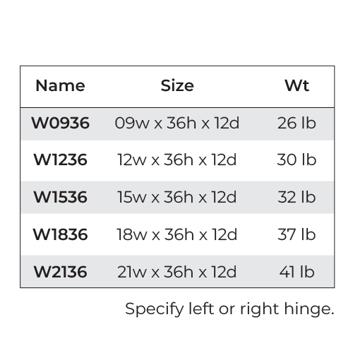 12"W x 12"D x 36"H ,15"W x 12"D x 36"H ,18"W x 12"D x 36"H ,21"W x 12"D x 36"H ,9"W x 12"D x 36"H |