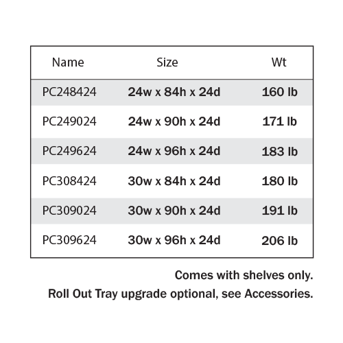 24"W x 24"D x 84"H ,24"W x 24"D x 90"H ,24"W x 24"D x 96"H ,30"W x 24"D x 84"H ,30"W x 24"D x 90"H ,30"W x 24"D x 96"H |