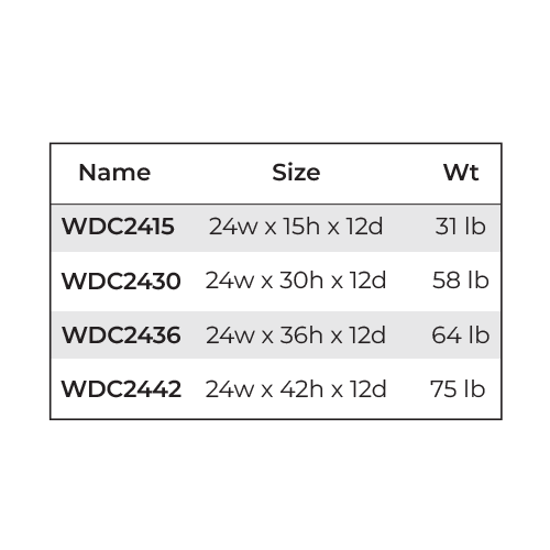 24"W x 12"D x 15"H ,24"W x 12"D x 30"H ,24"W x 12"D x 36"H ,24"W x 12"D x 42"H |