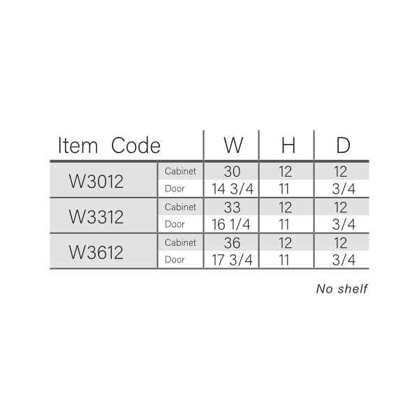 Cabinet Dimensions: 30″W x 12″H x 12″D, 33″W x 12″H x 12″D, 36″W x 12″H x 12″D