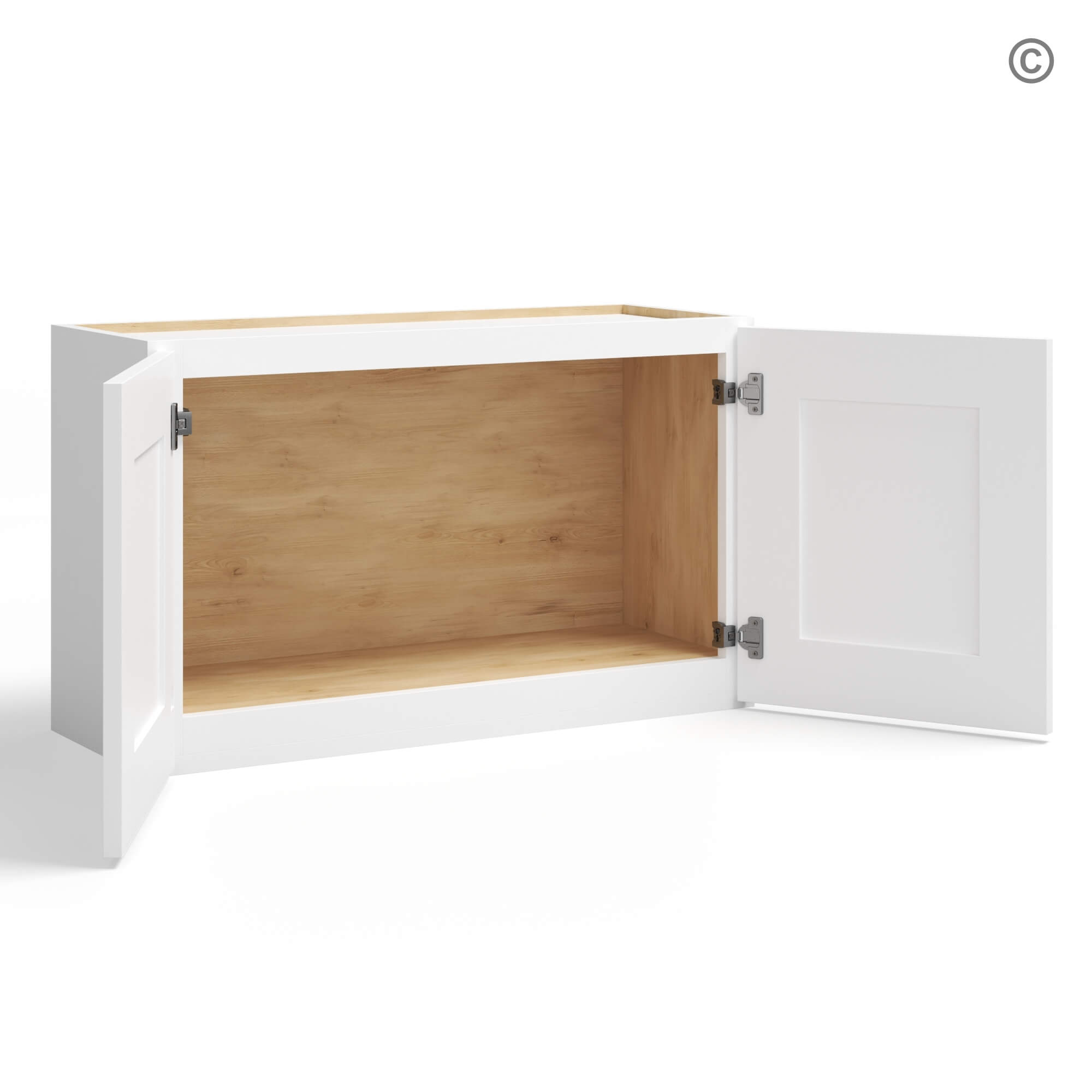 Designed for your convenience, this shaker white wall cabinet features European soft-close hinges on it’s double doors, ensuring smooth and quiet operation every time.