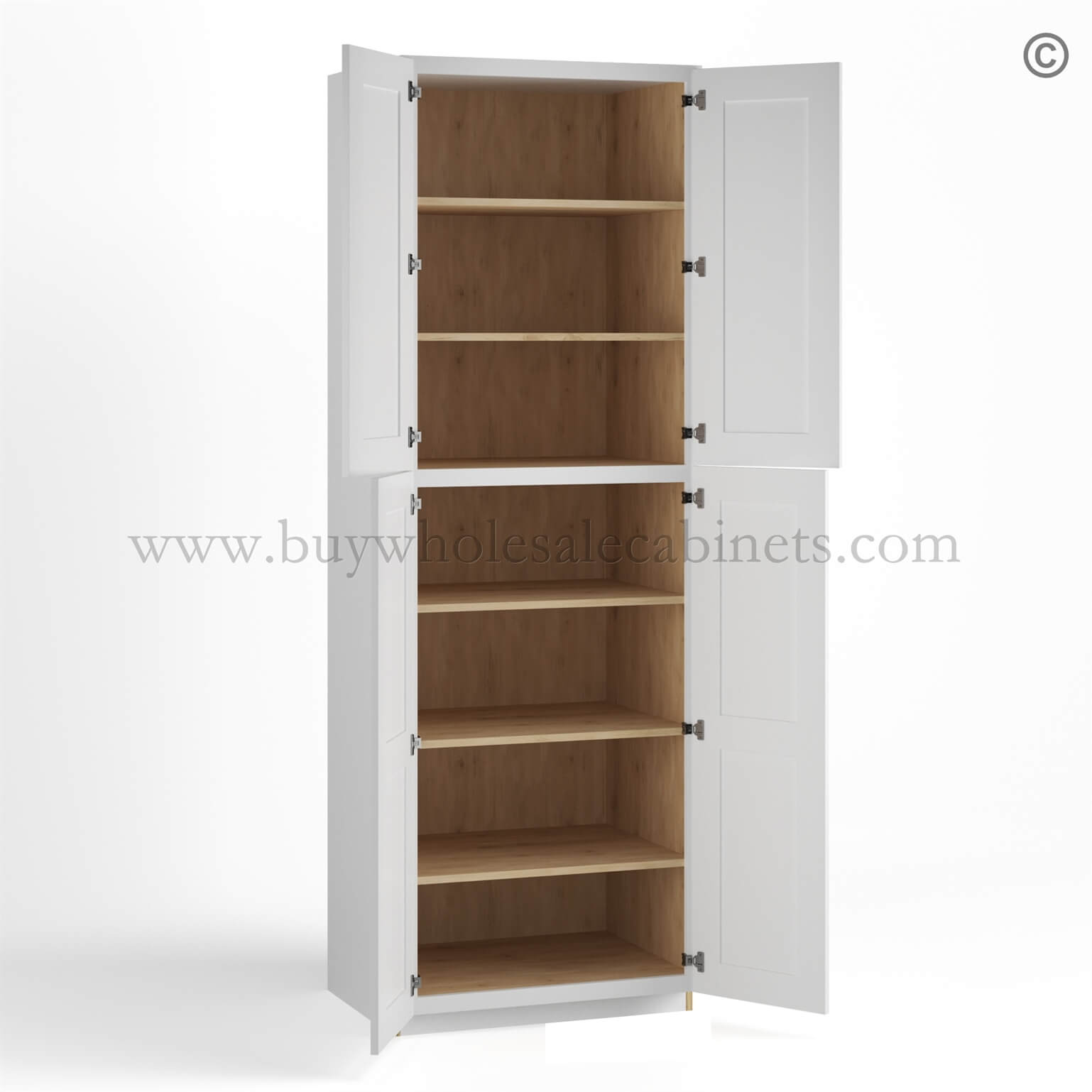 Our White Shaker 24 W Two Double Door Utility Pantry Cabinet is 24″ wide, 24″ deep, and available in 3 heights. (84″, 90″, 96″).