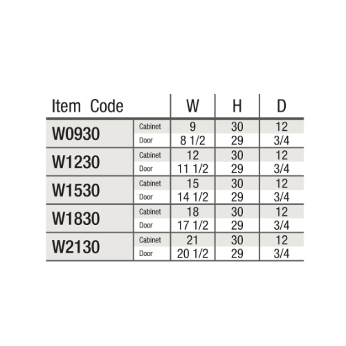 Cabinet Dimensions: 09″W x 30″H x 12″D, 12″W x 30″H x 12″D, 15″W x 30″H x 12″D, 18″W x 30″H x 12″D, 21″W x 30″H x 12″D