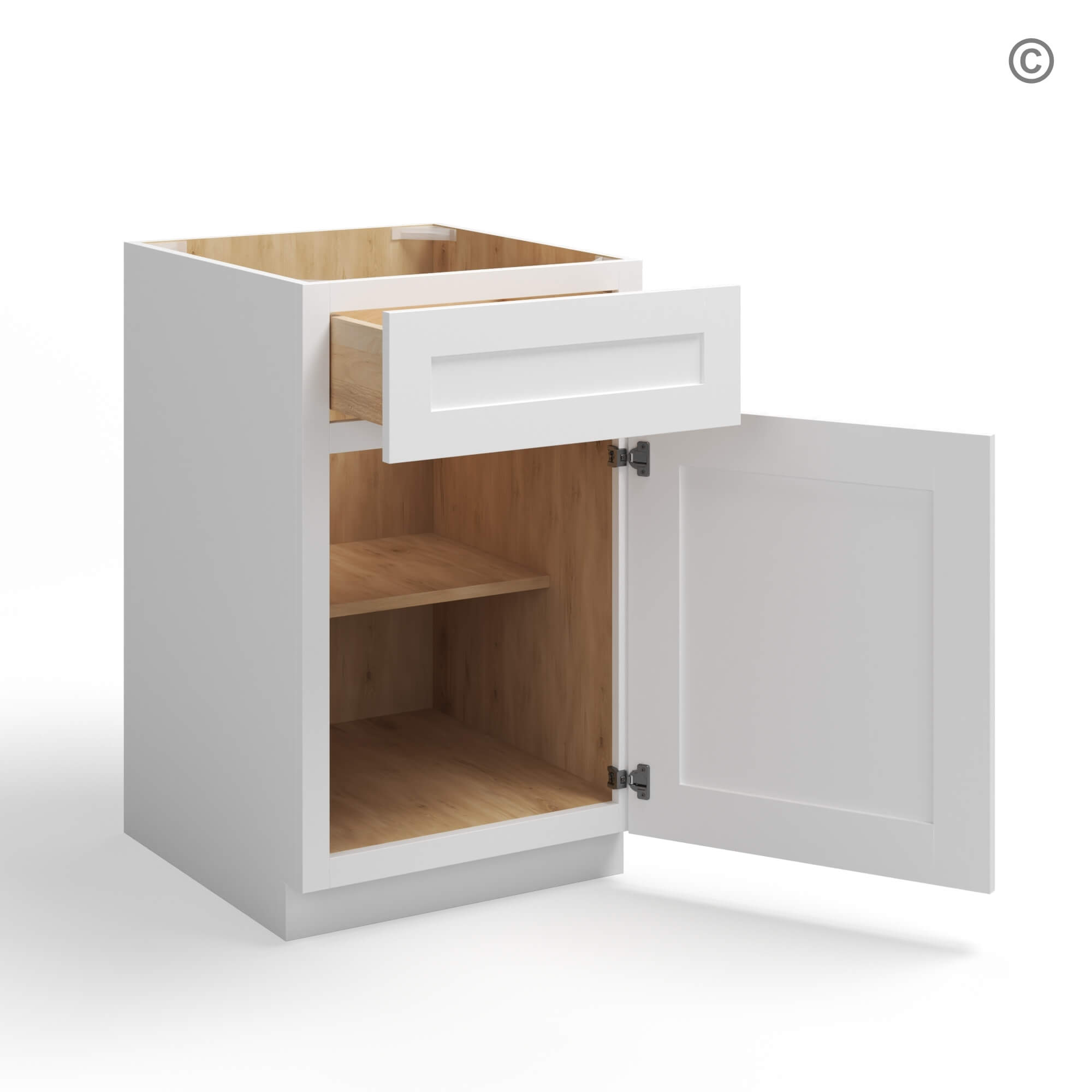 Designed for your convenience, this shaker white base cabinet features European soft-close hinges on it’s single door, and European soft-close full extension glides on it’s drawer, ensuring smooth and quiet operation every time.