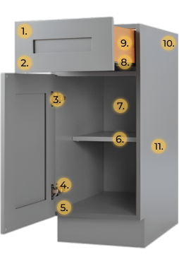 Full access frameless cabinets allow for ample storage. 18" adjustable, 3/4" thick plywood shelf has six finished sides and four metal shelf clips to withstand heavy items. Interior and exterior finishes match for a flawless look. Concealed under-mount drawer glides have full extension for easy access to the deepest part of the drawer. Solid wood drawer construction with four corner dovetail joints, the strongest joints used in cabinetry. Interior metal support brackets reinforce corners and create a stable and long-lasting foundation. The 3/4" furniture-grade box panel construction is 50% thicker than industry standards. All base cabinets in this product line are provided without toe kicks. Coordinating toe kicks can be purchased in the Accessories section and are required for this cabinet line.