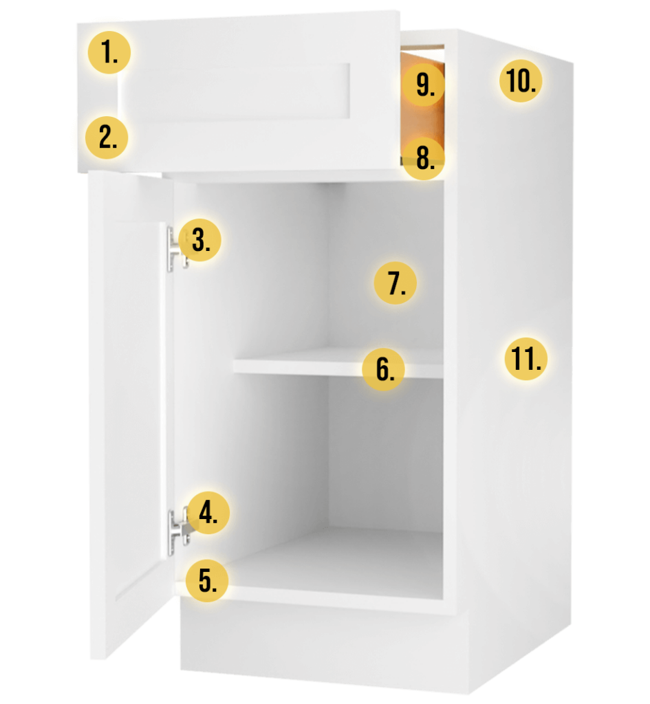 Full access frameless cabinets allow for ample storage. 18" adjustable, 3/4" thick plywood shelf has six finished sides and four metal shelf clips to withstand heavy items. Interior and exterior finishes match for a flawless look. Concealed under-mount drawer glides have full extension for easy access to the deepest part of the drawer. Solid wood drawer construction with four corner dovetail joints, the strongest joints used in cabinetry. Interior metal support brackets reinforce corners and create a stable and long-lasting foundation. The 3/4" furniture-grade box panel construction is 50% thicker than industry standards. All base cabinets in this product line are provided without toe kicks. Coordinating toe kicks can be purchased in the Accessories section and are required for this cabinet line.