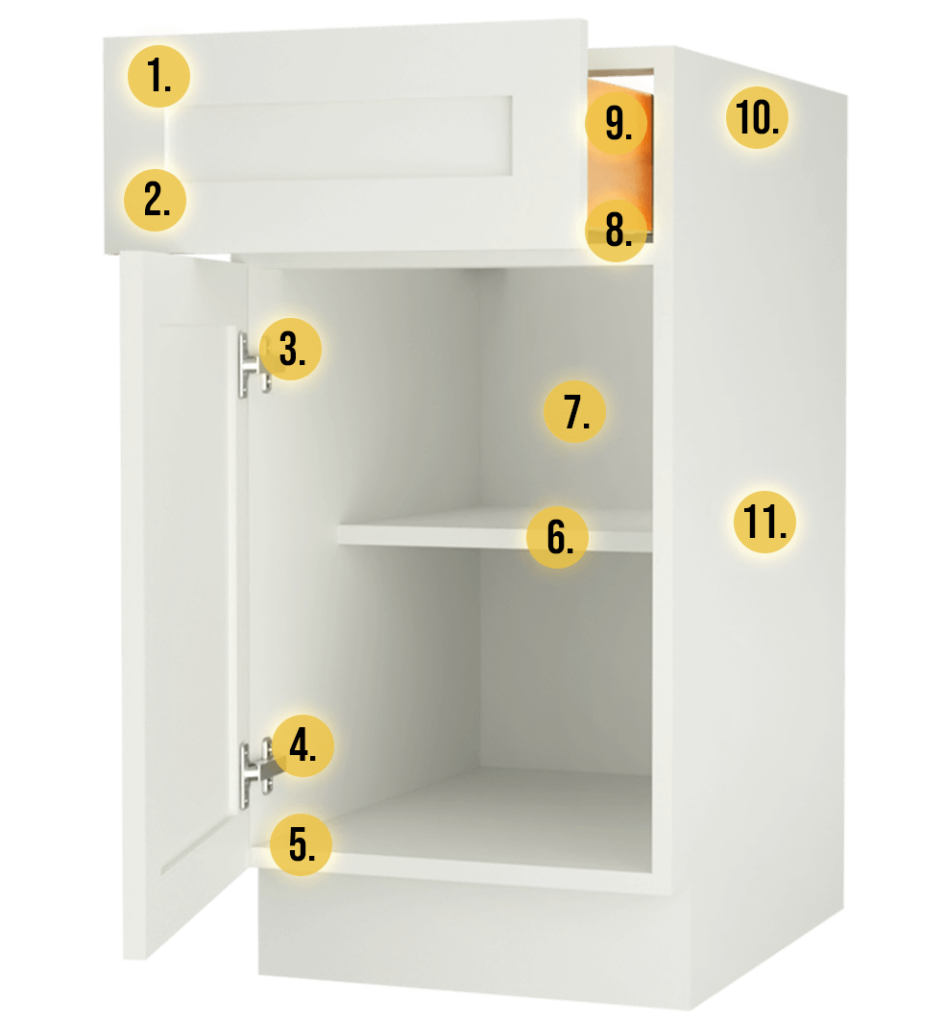 Full access frameless cabinets allow for ample storage. 18" adjustable, 3/4" thick plywood shelf has six finished sides and four metal shelf clips to withstand heavy items. Interior and exterior finishes match for a flawless look. Concealed under-mount drawer glides have full extension for easy access to the deepest part of the drawer. Solid wood drawer construction with four corner dovetail joints, the strongest joints used in cabinetry. Interior metal support brackets reinforce corners and create a stable and long-lasting foundation. The 3/4" furniture-grade box panel construction is 50% thicker than industry standards. All base cabinets in this product line are provided without toe kicks. Coordinating toe kicks can be purchased in the Accessories section and are required for this cabinet line.