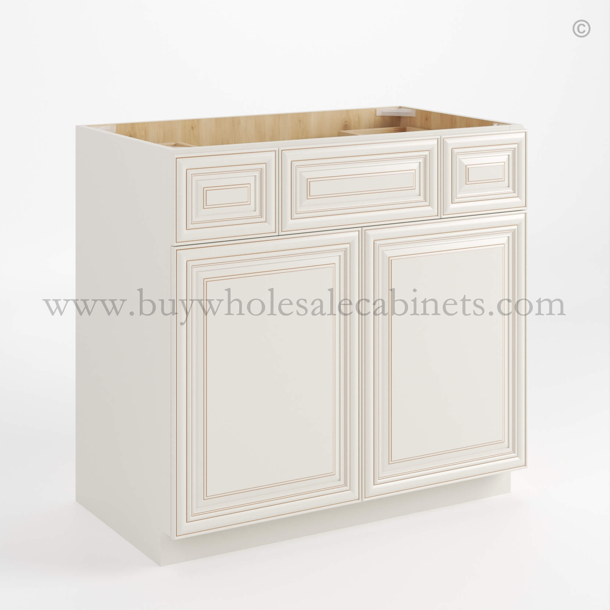Charleston White Raised Panel Vanity Three Drawer Base Cabinet
