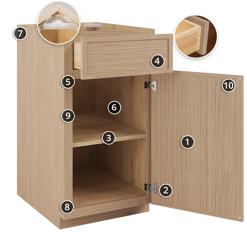 Arrives in 7-10 Business Days Full overlay panel, ¾" Birchwood with MDF insert 6-way adjustable European-style hinge with soft-close feature Shelving is ¾ inch thick cabinet-grade plywood with front edge banding Dovetail drawers with solid wood on all sides, full extension Under-mount full extension drawer glides with soft-close feature ½ inch cabinet-grade plywood box, UV coated natural plywood on interior Bracket reinforcements for base cabinet Double-doweled face frame joint ¾” Solid Birchwood face frame Door bumpersRTA Slim Oak Shaker Cabinets